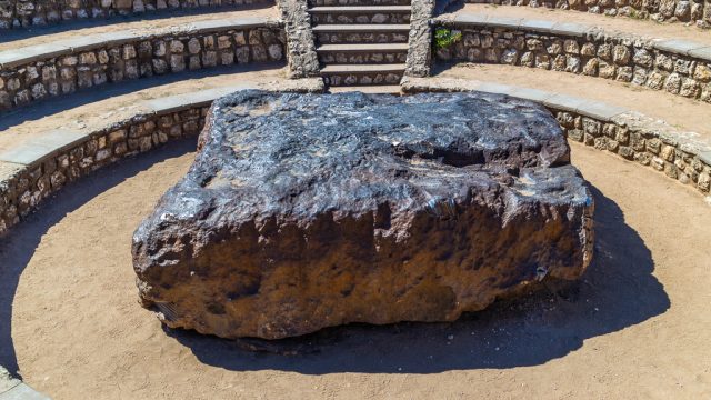 Der Hoba Meteorit wurde im März 1955 zum nationalen Denkmal erklärt und das Gelände im Jahr 1987 dem Rat für Denkmäler geschenkt, wo man dann ein sehr gepflegtes Besucherzentrum mit Grillplätzen errichtete. Vom Kassenhäuschen aus gesehen läuft man durch einen schön angelegten Garten hinüber zu einem „Naturlehrpfad“, wo ein Schild auf Deutsch und Englisch vor „herabfallenden Meteoriten“ warnt. Am Ende des Weges befindet sich das so genannten „Amphitheater“ in dem sich der Meteorit in 2 Metern tiefe befindet. Hier hat man dann die Gelegenheit, diesen mächtigen Brocken aus dem All auch mal anzufassen. Es ist faszinierend sich vorzustellen, dass dieser Stein aus dem All mal Teil eines größeren Asteroiden gewesen und Jahrmillionen einsam durch das All getrieben ist. Die Oberfläche sieht schwarz-grau bis braun-rötlich aus, ein Zeichen der starken Verwitterung. Vor allem auf der Oberseite erkennt man noch ganz gut die schwarze Schmelzkruste, die aufgrund der Reibungshitze, während des Durchgangs durch unsere Atmosphäre, entstanden ist. Am Eingang zum Gelände können sich Besucher über die Geschichte des Meteoriten informieren. Denn dort gibt es an einer Wand Infotafeln in den Sprachen Afrikaans, Englisch und Deutsch.
