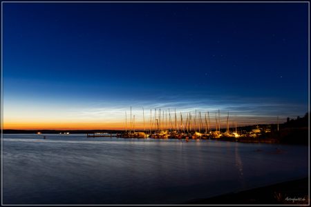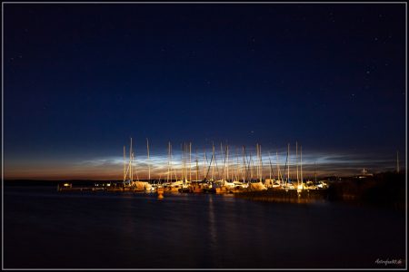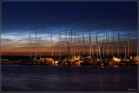In der Nacht vom 2. auf den 3. Juli 2019 gab es das zweitbeste Display Leuchtender Nachtwolken in dieser Saison, obwohl das OSWIN-Mesosphärenradar in Kühlungsborn an diesem Tag kein sehr auffälliges Signal registrierte. An diesem Abend hatte ich Spätdienst und habe nach Dienstschluss bereits vom Parkplatz der Firma aus einen hellen Schimmer, kaum oberhalb der Baumkronen, registriert. Seltsamerweise gab es zu dem Zeitpunkt noch keinen Thread im AK-Forum zu einer NLC-Sichtung. Ich fuhr in Richtung Diensdorf und wollte mich am Ufer des Scharmützelsees mit meiner Canon EOS M10, dem Kit-Objektiv und dem kleinen Reisestativ positionieren. Dort angekommen hatte ich einen hervorragenden Blick Richtung Norden und baute erstmal die Kamera auf. Leider musste ich feststellen, dass ein ziemlich starker Wind am Ufer des See in meine Richtung wehte und die Kamera leicht in Schwingungen versetzte. Die Leuchtenden Nachtwolken waren zu diesem Zeitpunkt bereits sehr auffällig. Sie standen kurz unterhalb von Capella im Sternbild Fuhrmann und waren über mehrer Dutzend Grad in azimutaler Richtung ausgedehnt. Aufgrund des Windes musste ich das Stativ hinter einer Parkbank positionieren und schirmte die Kamera so gut es ging mit meinem eigenen Körper ab. Entstanden ist dann dieses hübsche Panorama mit dem kleinen Jachthafen im Vordergrund und den Rauenschen Bergen im Hintergrund.