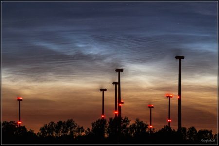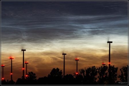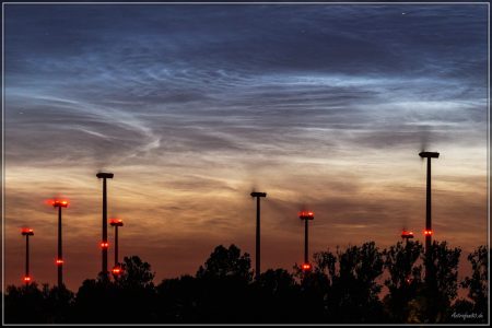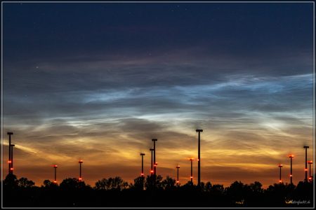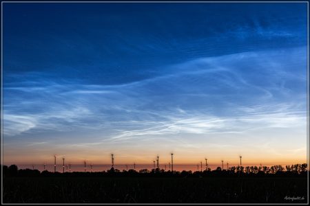 Gegen Mitternacht packte ich ein und fuhr in Richtung Lübben. Zu diesem Zeitpunkt hatte sich das Feld weiter nach Nordosten ausgedehnt und lag knapp über dem Horizont. Die NLC waren sehr auffällig und so beeilte ich mich bei Ankunft in meiner Heimatstadt, die große Kamerausrüstung zusammenzupacken. Kurz vor 2 Uhr morgens war ich schließlich in Radensdorf, nur einen Kilometer von meinem angestammten Beobachtungsstandort entfernt.