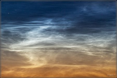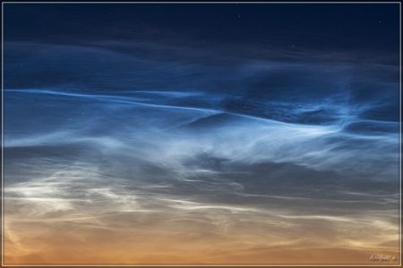 Auch die Formenvielfalt der NLC nahm zu diesem Zeitpunkt weiter zu. Ein mehrere Dutzend Grad langer und scharf ausgeprägter Streifen zog sich quer über dem Himmel und war dann selbst im Weitwinkel nur zur Hälfte zu erfassen. Stellenweise sah der Himmel wie ein gigantischer Mittelatlantischer Rücken aus. Dicke Bänder, unterbrochen von wellenartigen Mustern und Kämmen, waren überall zu sehen und spannten sich fast über dem gesamten Himmel. Gegen 4:15 Uhr verblassten schließlich die Wolken, ohne wirklich ganz zu verschwinden. Vor allem in mittlerer Höhe im Osten waren noch einige hellere Streifen zu erkennen. Deshalb packte ich die Ausrüstung wieder ins Auto und fuhr heim. Schließlich musste ich am frühen Nachmittag des nun neu angebrochenen Tages wieder zum Dienst erscheinen.