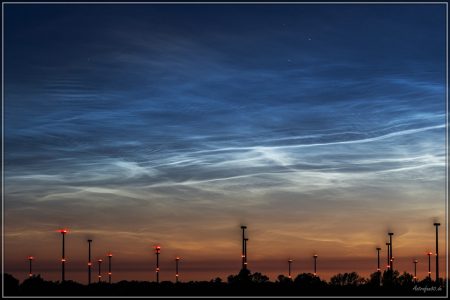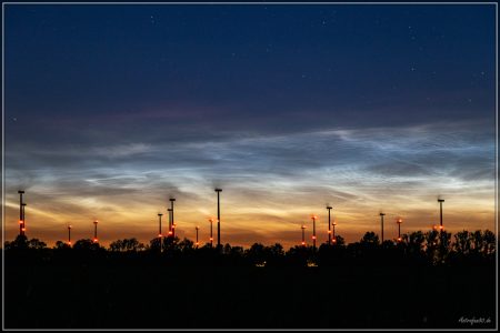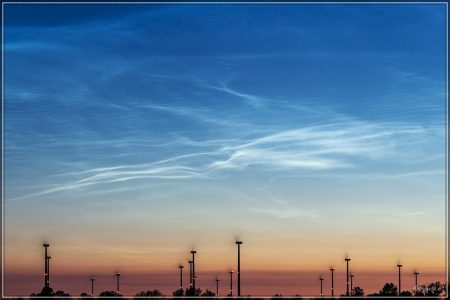 Das Feld Leuchtender Nachtwolken war immer noch deutlich sichtbar und stand in einer Höhe von gerade einmal 5 Grad über dem Horizont hinter dem Windpark Briesensee. Mit der Canon EOS 100D und dem 70–200 mm Teleobjektiv fotografierte ich Details in den Wolken. Mit meiber Canon EOS 6D und dem Kit-Objektiv wurden überwiegend Weitfeldbilder aufgenommen, die ich später zu mehreren Panoramas zusammenfügen wollte. Der recht kühle Wind hatte sich zu diesem Zeitpunkt glücklicherweise vollständig gelegt, so dass die Kälte an diesem Morgen erträglich war.
