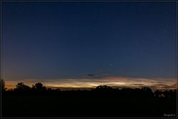 Die Fotoausrüstung war schnell zusammengepackt und so fuhr ich kurz nach 1 Uhr raus nach Treppendorf. Die Leuchtenden Nachtwolken hingen tief über dem Horizont und wurden stellenweise von troposphärischen Wolken getrübt. Das NLC-Display über dem Nordhorizont war selbst um die lokale Mitternacht noch gut sichtbar. Das war ein gutes Zeichen für ein eindrucksvolles Morgendisplay. Der schneidige Westwind, nach dem Durchzug der Kaltfront am Montag, war allerdings für meine Canon EOS 100D mit dem 70–200 mm Teleobjektiv ein Problem. Die Böen verwackelten die Aufnahmen immer mal wieder, so dass ich mich mit einem Regenschirm als Windschutz aushelfen musste.