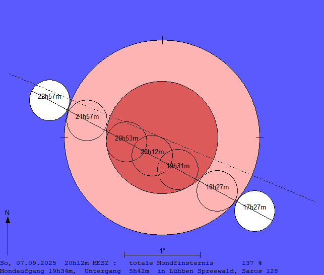 Die Finsternis beginnt mit dem Eintritt des Mondes in den Halbschatten der Erde um 17:27 Uhr. Der Eintritt des Mondes in den Kernschatten erfolgt um 18:27 Uhr und der Beginn der Totalität um 19:31 Uhr. Von meinem Heimatstandort Lübben aus gesehen geht der Mond allerdings erst um 19:34 Uhr auf. Man muss ein paar Minuten warten, bis sich der Mond genügend aus den horizontnahen Dunstschichten der Erdatmosphäre herausbewegt hat, um ihn mit Hilfe des Feldstechers überhaupt erkennen zu können. Er erscheint unter guten Bedingungen schließlich als rötliche Scheibe vor einem dunkelblauen Hintergrund.