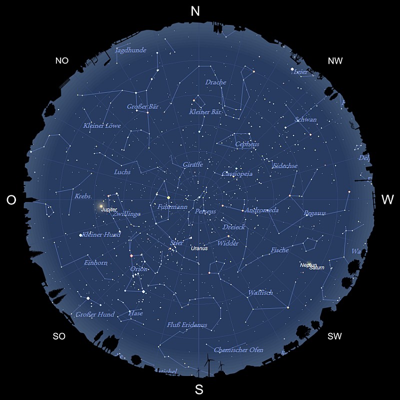 Bli­cken wir in süd­li­cher Rich­tung senk­recht über unse­re Köp­fe, sehen wir das Stern­bild Per­seus in sei­ner höchs­ten Stel­lung am Him­mel. Hier lohnt sich ein Blick auf den Dop­pel­stern­hau­fen h & Chi Pers­ei, der im Fern­glas präch­tig erscheint und bereits mit dem blo­ßen Auge als klei­nes, aus­ge­dehn­tes Wölk­chen erkenn­bar ist. Wei­ter öst­lich wird auch das Stern­bild Fuhr­mann mit dem hell leuch­ten­den Stern Capel­la bald den Meri­di­an über­schrei­ten. In die­sem Stern­bild befin­den sich zahl­rei­che hel­le, offe­ne Stern­hau­fen, die sich eben­falls mit dem Feld­ste­cher gut beob­ach­ten las­sen. Unter­halb die­ser bei­den Stern­bil­der steht der Stier mit dem röt­li­chen Haupt­stern Alde­ba­ran und den bei­den offe­nen Stern­hau­fen Hya­den und Ple­ja­den. Süd­öst­lich des Stiers fällt der mäch­ti­ge Him­mels­jä­ger Ori­on auf, der aus zahl­rei­chen hel­len Ster­nen besteht. Auf­fäl­lig an die­sem Stern­bild sind die drei mar­kan­ten Gür­tel­ster­ne. Auch der obe­re, röt­lich leuch­ten­de Schul­ter­stern Betei­geu­ze und der bläu­lich erschei­nen­de Fuß­stern Rigel ste­chen her­vor. Im Schwert­ge­hän­ge des Ori­on befin­det sich zudem der berühm­te Ori­on­ne­bel, der zu den ein­drucks­volls­ten Nebeln des Him­mels zählt. Unter­halb des Him­mels­jä­gers Ori­on ist das Stern­bild Hase erkenn­bar. Siri­us, der hells­te Stern des Him­mels und Haupt­stern des Gro­ßen Hun­des, ist gera­de über dem Süd­ost­ho­ri­zont erschie­nen. West­lich von Ori­on ver­läuft der Fluss Eri­danus. Des­sen hells­ter Haupt­stern, Acher­nar, ist aller­dings nur von der süd­li­chen Erd­halb­ku­gel aus zu sehen. Wei­ter west­lich steht das aus­ge­dehn­te Herbst­stern­bild des Wal­fi­sches. In mitt­le­rer Höhe im Süd­wes­ten befin­den sich die Fische, in denen sich der­zeit auch der Ring­pla­net Saturn auf­hält. Öst­lich der Fische und ober­halb des Wal­fi­sches ent­de­cken wir das Stern­bild Wid­der. Dar­über sind noch die Stern­bil­der Drei­eck und Andro­me­da erkennbar.